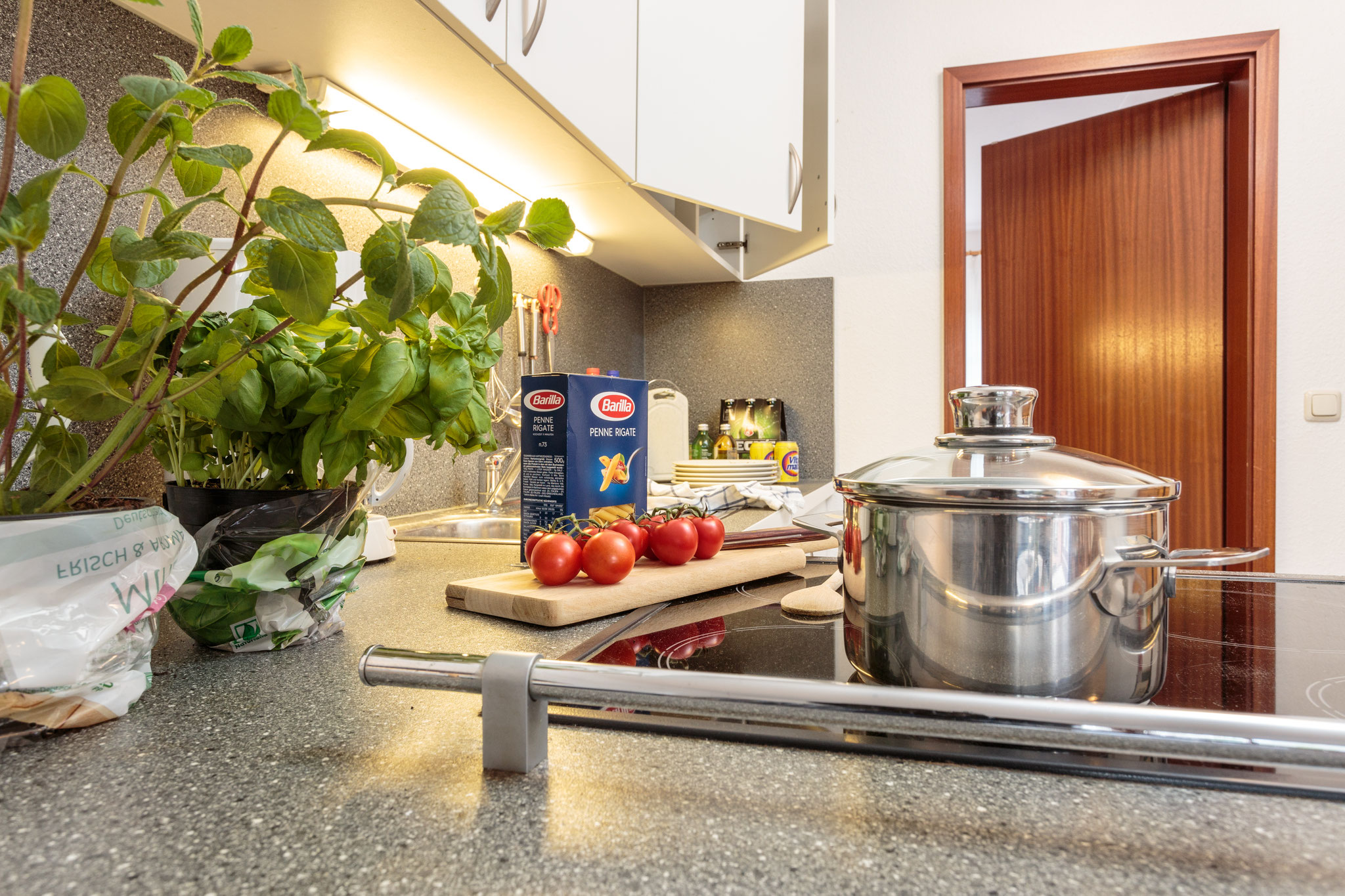 Offene Küche mit E-Herd + Ceranfeld, Kühlschrank (+Gefrierfach) & Geschirrspülmaschine.