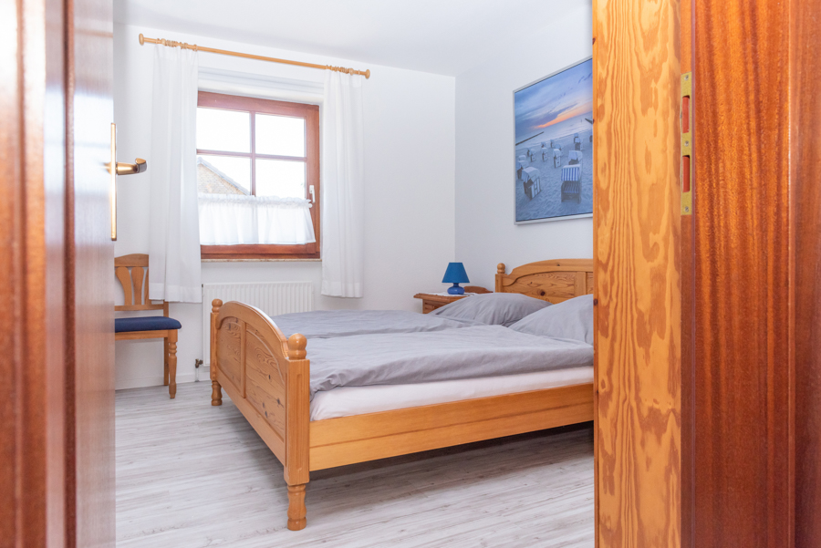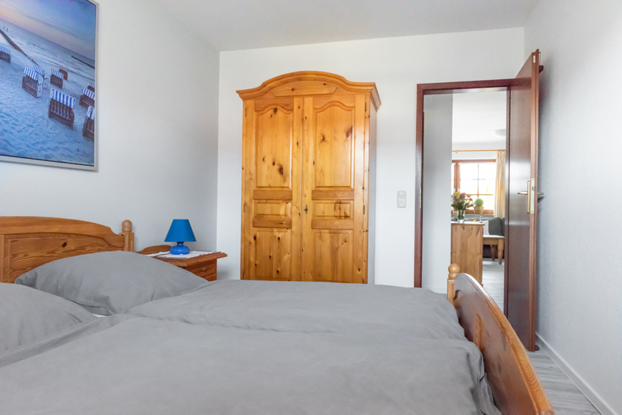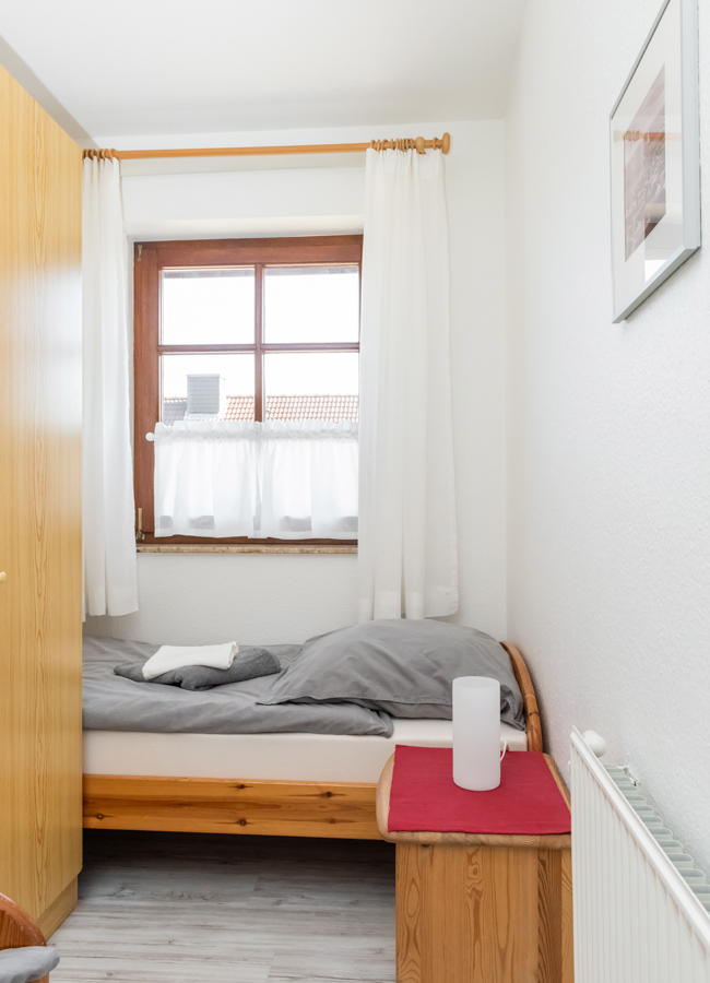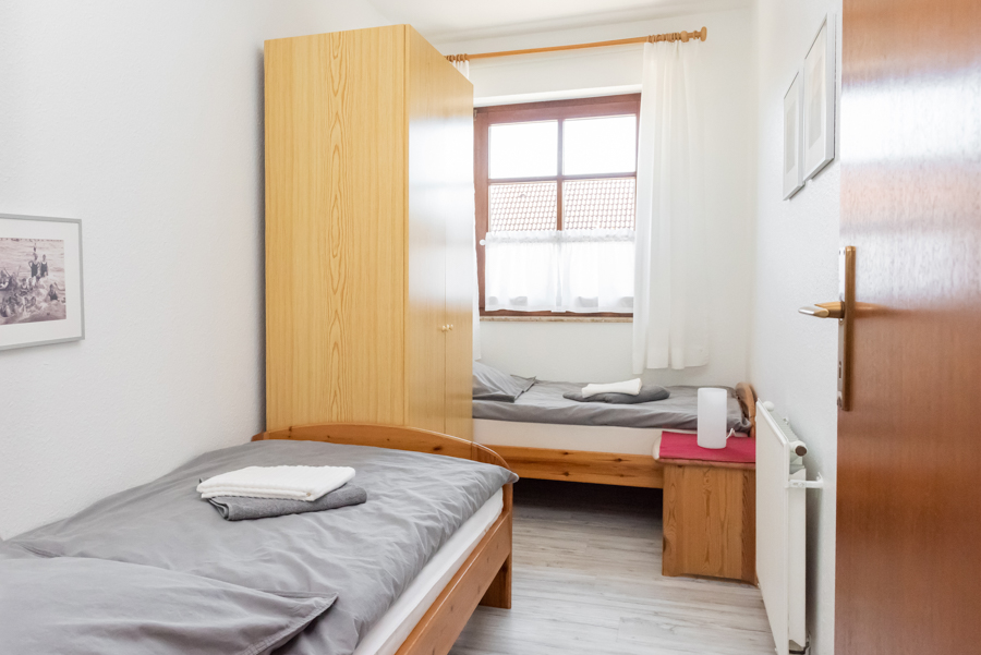 Schlafzimmer mit zwei Einzelbetten (eins davon Kinderbett: Länge 170cm).